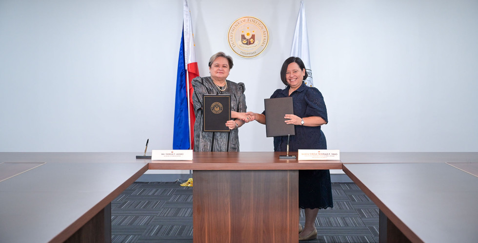 The signing ceremony, held at the Carlos P. Garcia Conference Room in Double Dragon Tower, was led by Secretary of Foreign Affairs Ma. Theresa P. Lazaro, Chairperson of IBF. Representing FEU were Dr. Maria Teresa Trinidad P. Tinio, Senior Vice President for Academic Affairs, and Dr. Michelle S. Acomular, Vice President for Admissions and Financial Assistance.